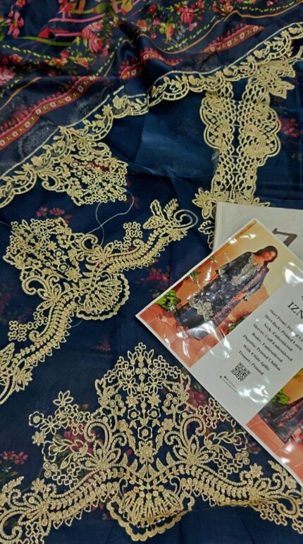 Aneela's Summer Collection 2026 Lawn Edition has a chic ready-to-wear style ideal for daily elegance. This ensemble, which is made of lawn fabric of export grade, has an embroidered sleeve for a sophisticated look and a fully printed front that is accentuated with a lovely neck and daman patches. The embroidered organza dupatta gives a touch of sophistication, while the printed back and trousers create a unified, fashionable design. This design is provided at an appealing wholesale price of Rs. 3350, excluding delivery fees, and is available in stock under Code 1636.