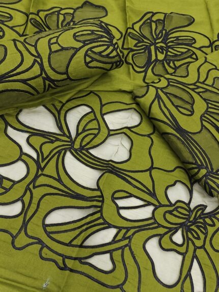 The exquisitely made three-piece khadi net Collection 2026 Lawn Suit (Code 1684) is intended to provide a sophisticated and cosy summertime appearance. This outfit guarantees a comfortable, airy feel that is perfect for warm weather because it is made from high export-quality grass fabric. The shirt's fully printed front is complemented by tasteful patches, and its delicately embroidered sleeves lend an air of refinement. For a well-balanced and elegant look, the trouser and back are left unadorned. It completes the ensemble with carefree flair thanks to a lightweight, ready-to-wear patterned chiffon dupatta. A great addition to any summer wardrobe, this suit is in stock for a wholesale price of Rs. 3000 (not including shipping fees).