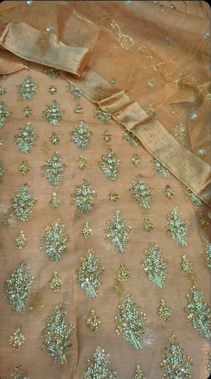 The exquisitely made three-piece khadi net  Collection 2026 Lawn Suit (Code 1684) is intended to provide a sophisticated and cosy summertime appearance. This outfit guarantees a comfortable, airy feel that is perfect for warm weather because it is made from high export-quality grass fabric. The shirt's fully printed front is complemented by tasteful patches, and its delicately embroidered sleeves lend an air of refinement. For a well-balanced and elegant look, the trouser and back are left unadorned. It completes the ensemble with carefree flair thanks to a lightweight, ready-to-wear patterned chiffon dupatta. A great addition to any summer wardrobe, this suit is in stock for a wholesale price of Rs. 3000 (not including shipping fees).