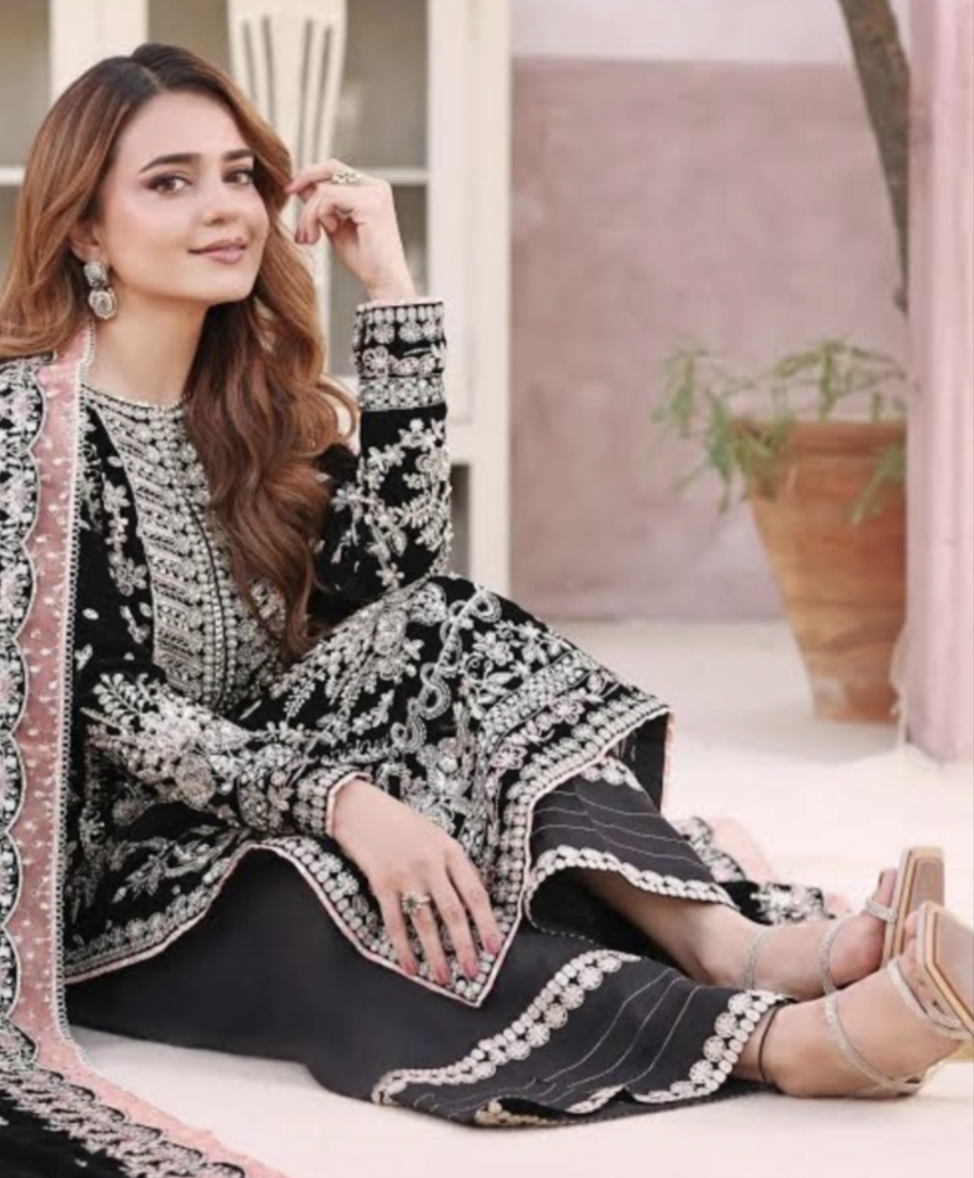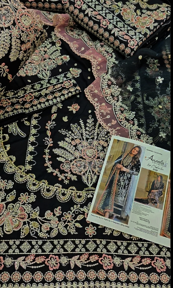 This elegant black dress from ANEELAS BRAND features a heavily embroidered Front with delicate sequin work and fine thread. The look remains effortlessly stylish when paired with a simple pair of TROUSER , simple Back and EMB Sleeves. finished with a ready-to-wear khadi net Dupatta that has a delicate peach organza border for the ideal amount of refinement.