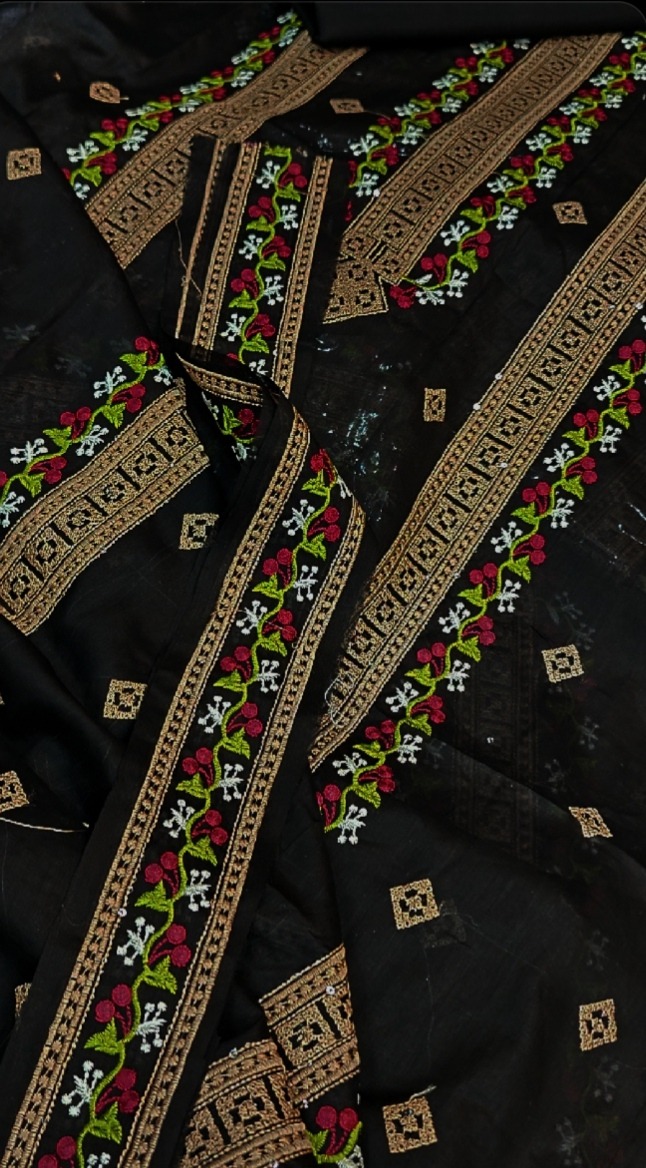 This lovely three-piece printed lawn dress from Alkaram is ideal for the summer. Large floral motifs in sophisticated off-white hues cover the dress's black basis, while delicate yellowish tones provide a vivid and new touch. It is lightweight, breathable, and perfect for warm weather because it is made of high-quality grass fabric. It is appropriate for semi-formal events as well as casual wear due to its fashionable print and cosy fabric. This gorgeous Three-piece dress, which combines style and quality in one ensemble, is reasonably priced at PKR 2150.
