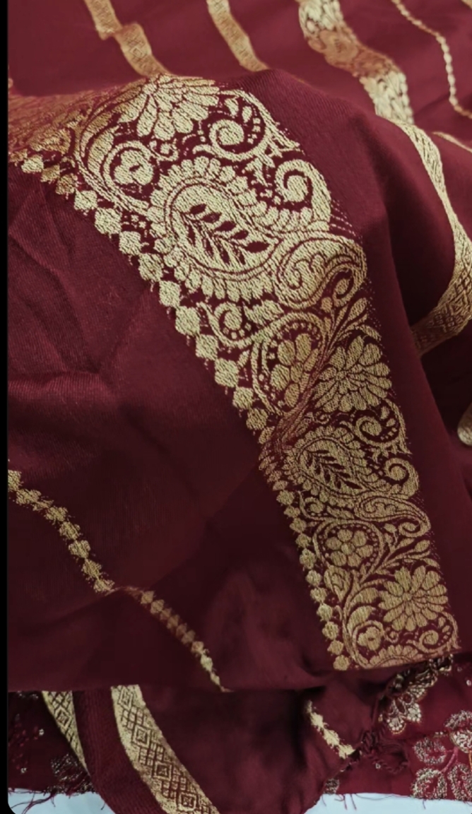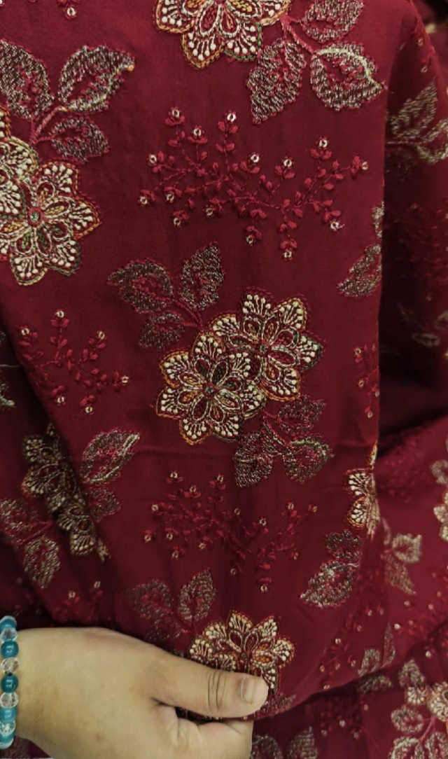 This Bareeze mehroon ensemble, made of warm peach wool fabric and embellished with elegant golden embroidery, will help you transition into winter elegance. Originally priced at 6200, it is currently only 3350.