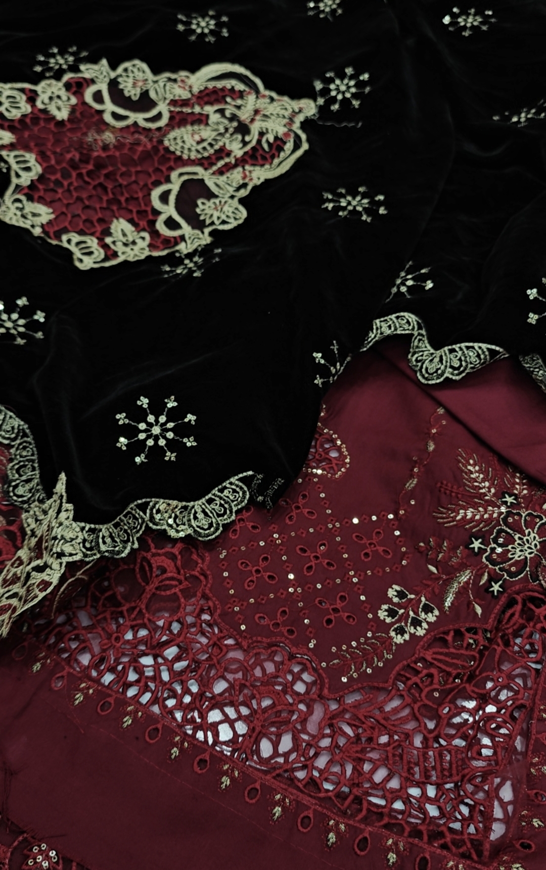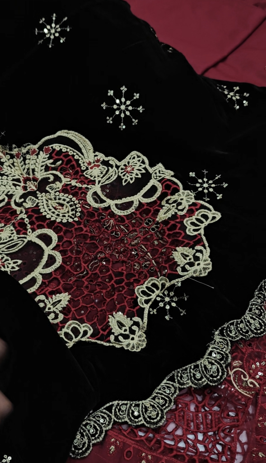 Barouqe’s sophisticated three-piece mehroon set consists of a black velvet shawl and a kurta and trousers made of peach wool. This set, which was initially priced at 9500, is now only 5650, making it ideal for the winter.