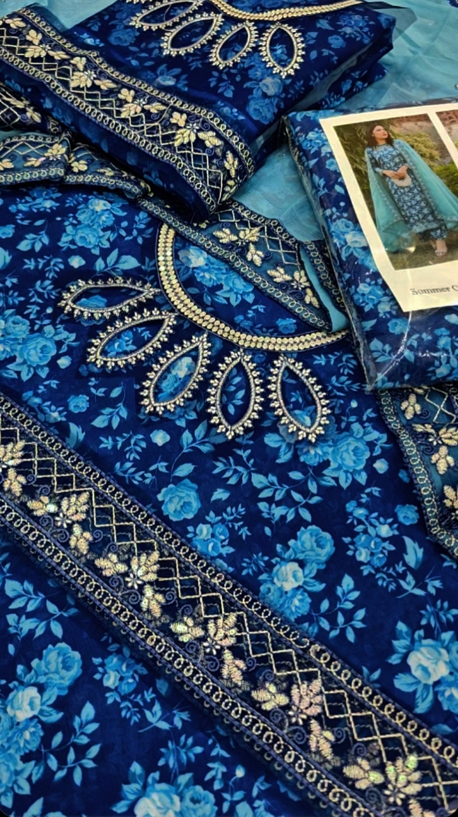 A sophisticated and high-end lawn ensemble designed for the summer. This export-quality design has an organza neck, daman patches, and a fully heavy embroidered front accentuated with laser work, giving it a rich and opulent appearance. The plain back and trousers maintain the ensemble's ideal balance and comfort, while the embroidered sleeves with patch details give added charm. It is combined with a ready-to-wear khaddi net dupatta finished with an elegant organza pallu, making it great for festival wear and formal events.
