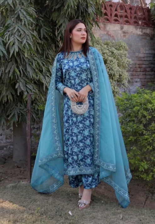 A sophisticated blue and white contrast dress with a gorgeously printed front and back and matching printed pants. Delicate prints and fashionable patch detailing adorn the sleeves, while a graceful daman patch and a neck patti embellished with fine thread embroidery finish the front. This ensemble offers the ideal balance of comfort and classic charm, finished with a lightweight chiffon dupatta.