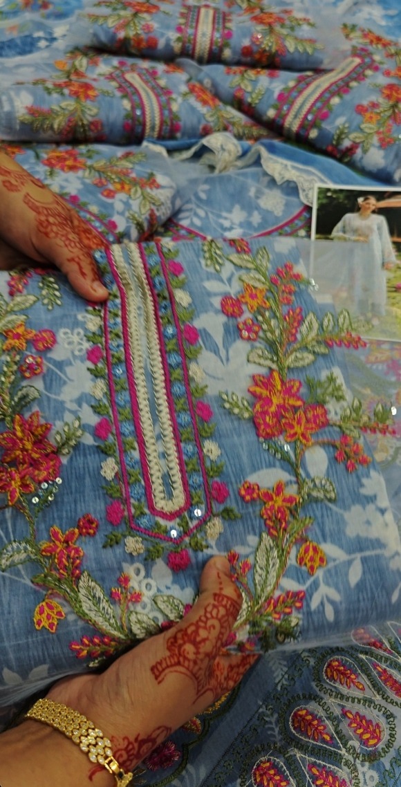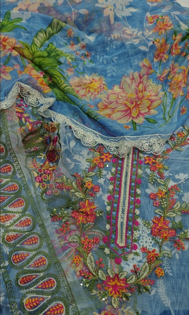 This beautiful 3-piece unstitch dress in a soothing sky color is a perfect blend of elegance and style. The outfit features a lawn shirt with printed chicken kari design on the front and back, along with printed sleeves that enhance its overall charm. It includes a stylish daman patch, neck patch, and sleeves patch, adding a refined and detailed finish to the look. The dress is paired with a printed trouser that complements the shirt design perfectly. Completing the ensemble is a chiffon dupatta, giving it a light and graceful appeal. Priced at 3450, this dress is an ideal choice for a chic and comfortable outfit that can be stitched according to your preference.