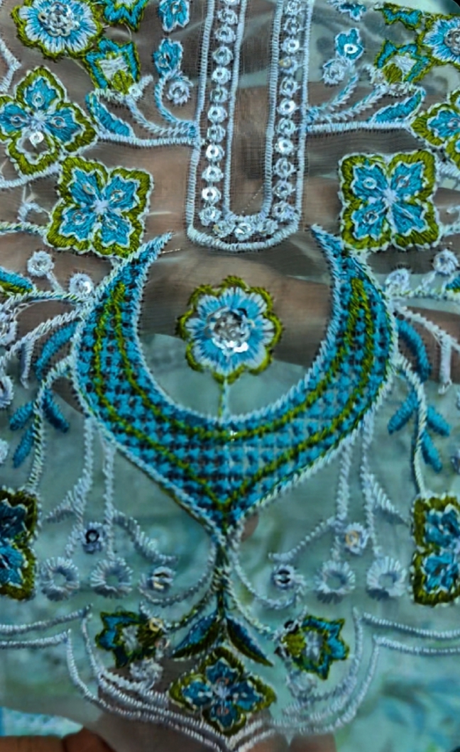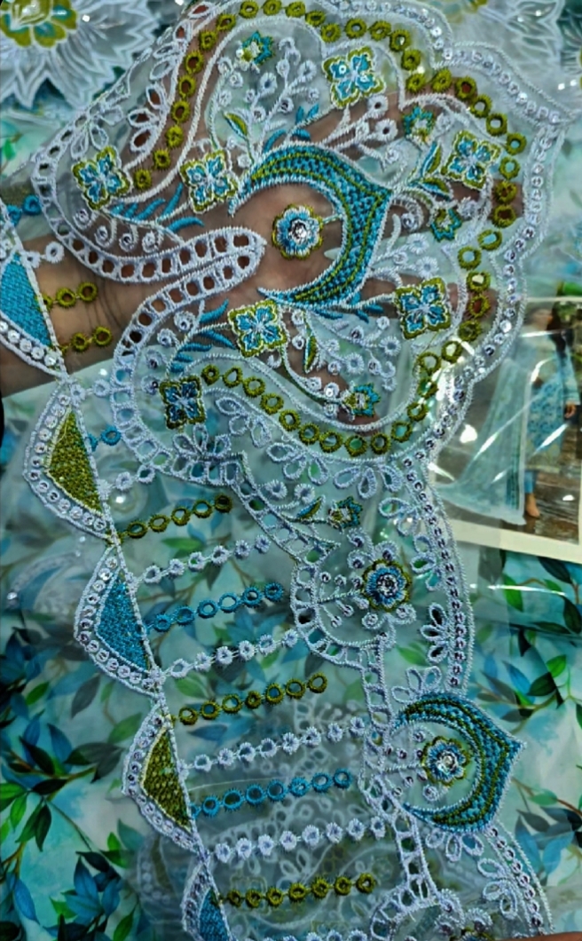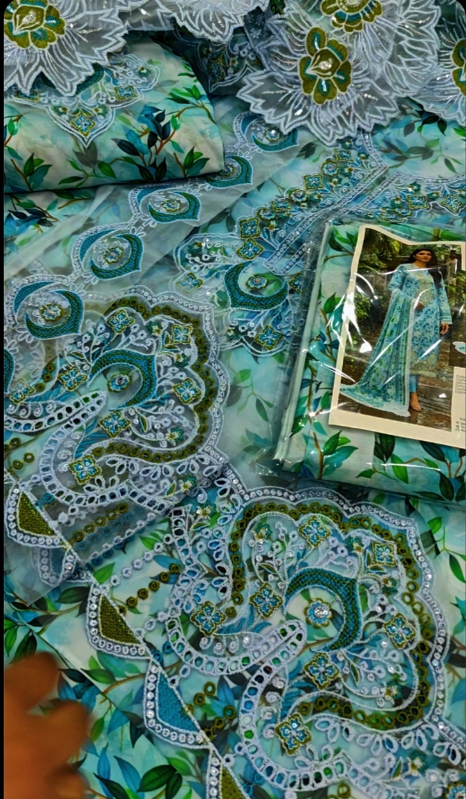 A sophisticated and high-end lawn ensemble designed for the summer. This export-quality design has an organza neck, daman patches, and a fully heavy embroidered front accentuated with laser work, giving it a rich and opulent appearance. The plain back and trousers maintain the ensemble's ideal balance and comfort, while the embroidered sleeves with patch details give added charm. It is combined with a ready-to-wear khaddi net dupatta finished with an elegant organza pallu, making it great for festival wear and formal events.
