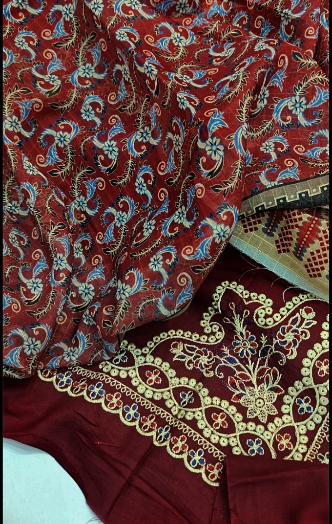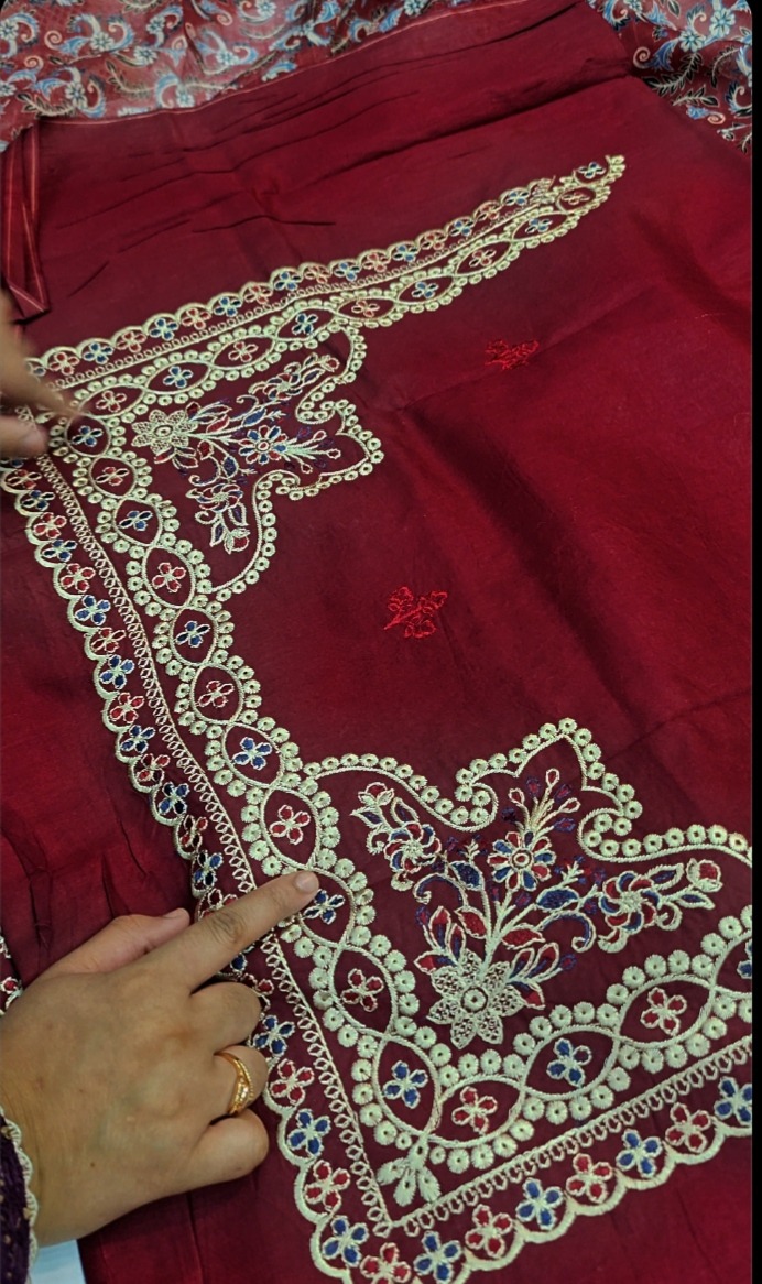 A sophisticated and high-end lawn ensemble designed for the summer. This export-quality design has an organza neck, daman patches, and a fully heavy embroidered front accentuated with laser work, giving it a rich and opulent appearance. The plain back and trousers maintain the ensemble's ideal balance and comfort, while the embroidered sleeves with patch details give added charm. It is combined with a ready-to-wear khaddi net dupatta finished with an elegant organza pallu, making it great for festival wear and formal events.