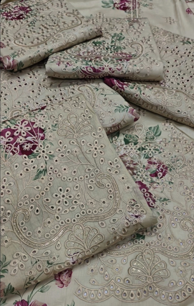 Aneela's Summer Collection 2026 Lawn Edition has a chic ready-to-wear style ideal for daily elegance. This ensemble, which is made of lawn fabric of export grade, has an embroidered sleeve for a sophisticated look and a fully printed front that is accentuated with a lovely neck and daman patches. The embroidered organza dupatta gives a touch of sophistication, while the printed back and trousers create a unified, fashionable design. This design is provided at an appealing wholesale price of Rs. 3350, excluding delivery fees, and is available in stock under Code 1636.