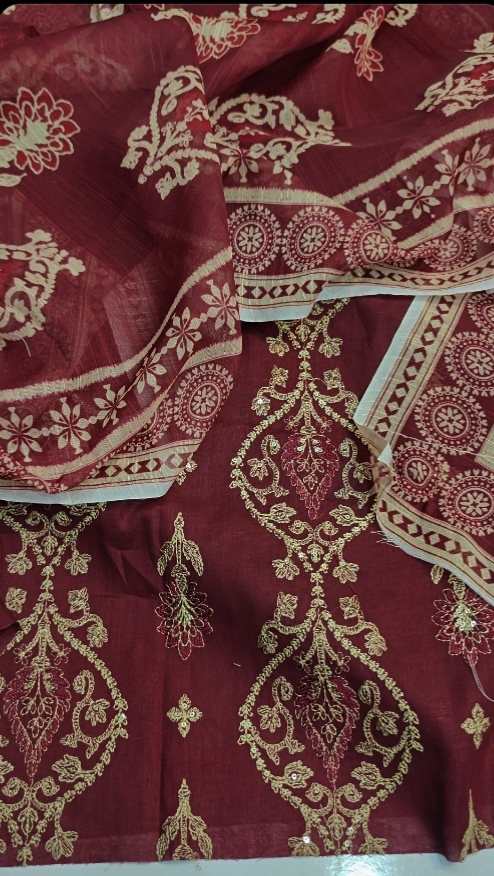 For summer comfort, this high-quality lawn suit has a plain back, lightweight embroidered sleeves, and full front embroidery. Comes with a Plain Trouser and a Printed Voil Dupatta, great for everyday wear and informal situations.
