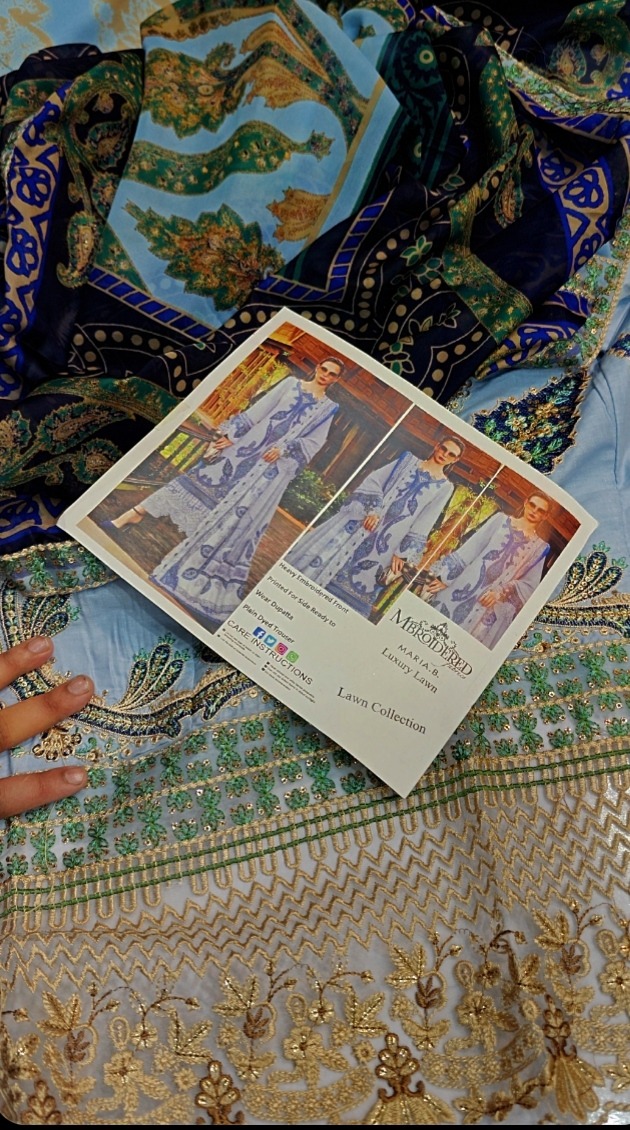 The Summer Collection 2026-Lawn Collection by Maria B, which is currently in stock at wholesale prices, exudes elegance. This gorgeous embroidered grass suit (Code: 1684) has wonderfully embroidered sleeves that go well with the large, heavy embroidered front, which gives it a rich, opulent appearance. The ready-to-wear silk printed dupatta gives a touch of elegance and charm, while the plain back and plain trousers provide a balanced and elegant finish. This gorgeous suit, which is made from export-quality lawn fabric and costs just Rs. 4550 (not including shipping fees), is the ideal addition to upscale summer collections.