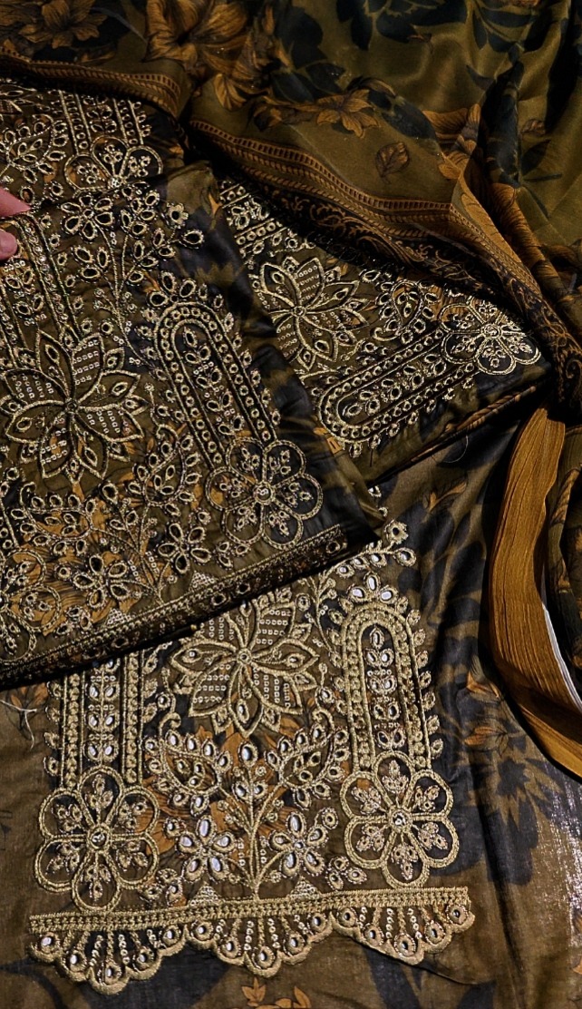 Made from top export-quality lawn cloth, the Mohagni Summer Collection 2026 lawn suit is in stock and ideal for comfortable yet fashionable summer attire. This sophisticated style has printed sleeves with matching patches and a fully printed front enhanced with neck and daman patches. To create a unified and colourful appearance, the back and trousers are totally printed. A ready-to-wear chiffon dupatta complements it, adding a delicate and elegant touch. The wholesale price of this lawn suit (product code 1684) is Rs. 3350, not including shipping fees.