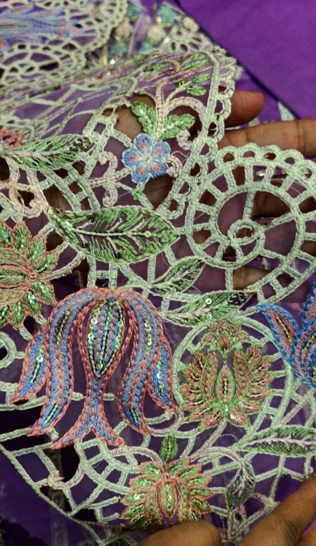The Maria B Summer Collection 2026 lawn suit is made of high-end, export-grade lawn fabric and is in stock. A totally heavy embroidered front with intricate sequence work and exquisitely crafted neck and daman patches complete this sophisticated embroidered design. In order to counterbalance the lavish front decoration, the back and trousers are left simple, while the sleeves are embroidered and accented with matching patches. It adds a refined and opulent touch when worn with a ready-to-wear khaddi net dupatta with exquisite cutwork. This ensemble, product code 1684, is available at a wholesale price of Rs. 4850, minus delivery fees, and is perfect for festive and semi-formal summer wear.