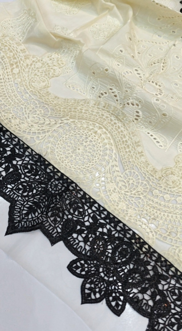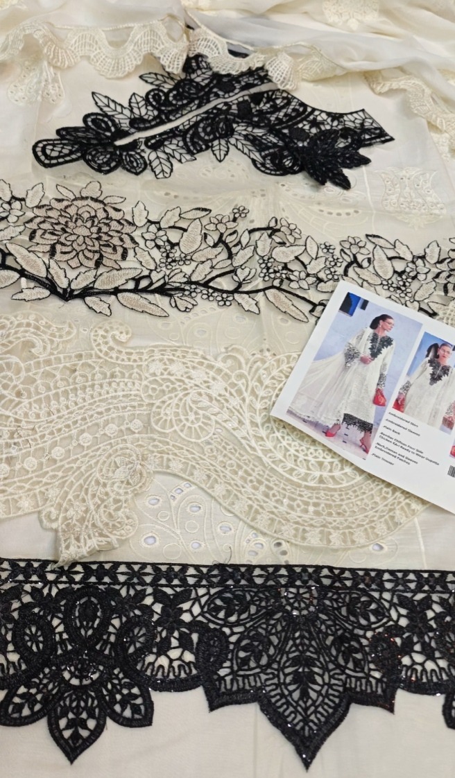 Presenting Maria B's Summer Collection 2026 Lawn Edition, a sophisticated ready-to-wear ensemble with opulent accents. This outfit, which is made from export-quality lawn fabric, has a fully embroidered front that is accentuated by a sophisticated organza neck patch and daman patch. It is exquisitely finished with laser-cut work. A modern touch is added to the sleeves with laser-cut pieces of embroidered organza. The style is balanced and airy for summer thanks to the simple back and trousers. A ready-to-wear khaddi net dupatta with elegant laser-cut details completes the ensemble. In stock for a wholesale price of Rs. 5350 (not including delivery fees).