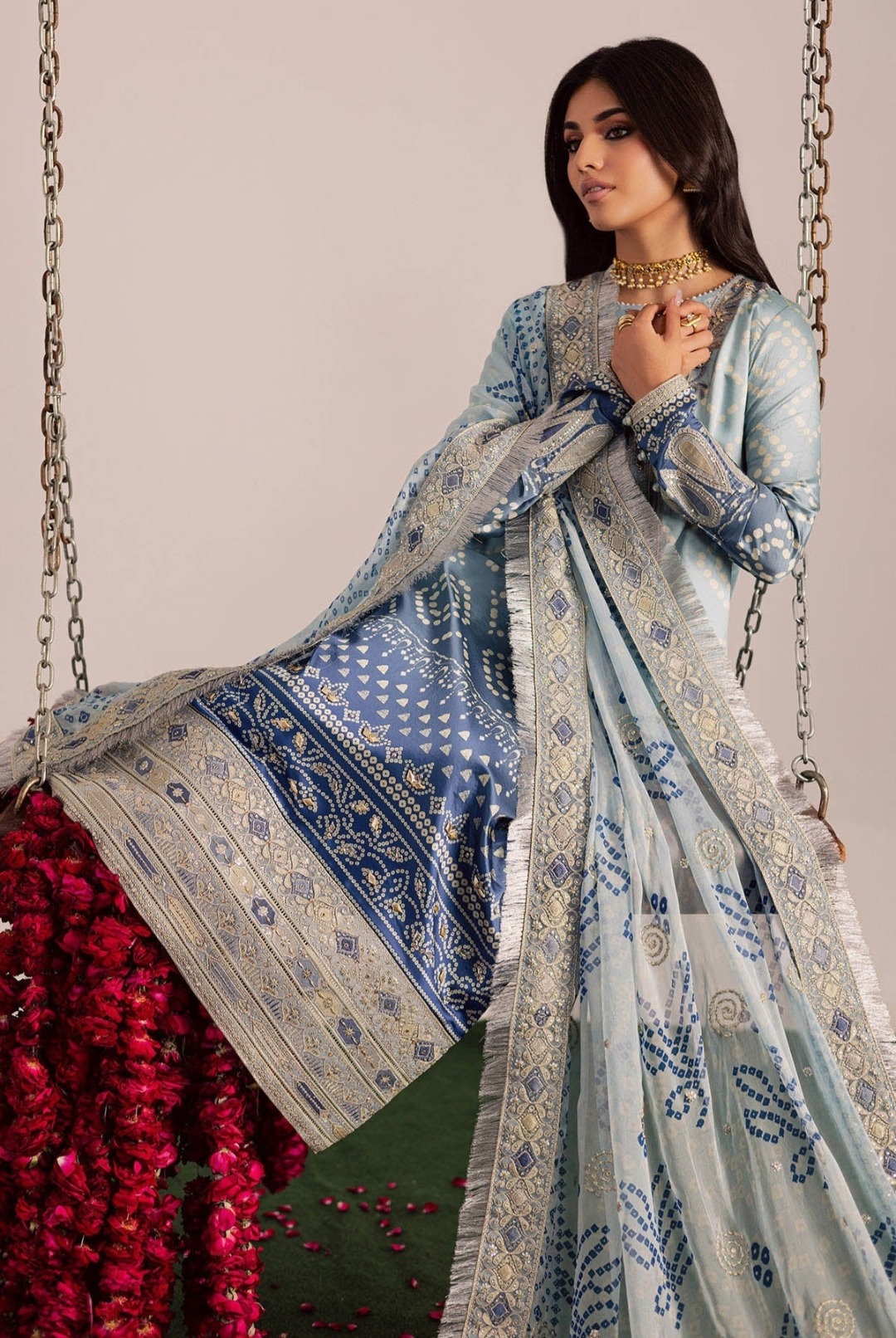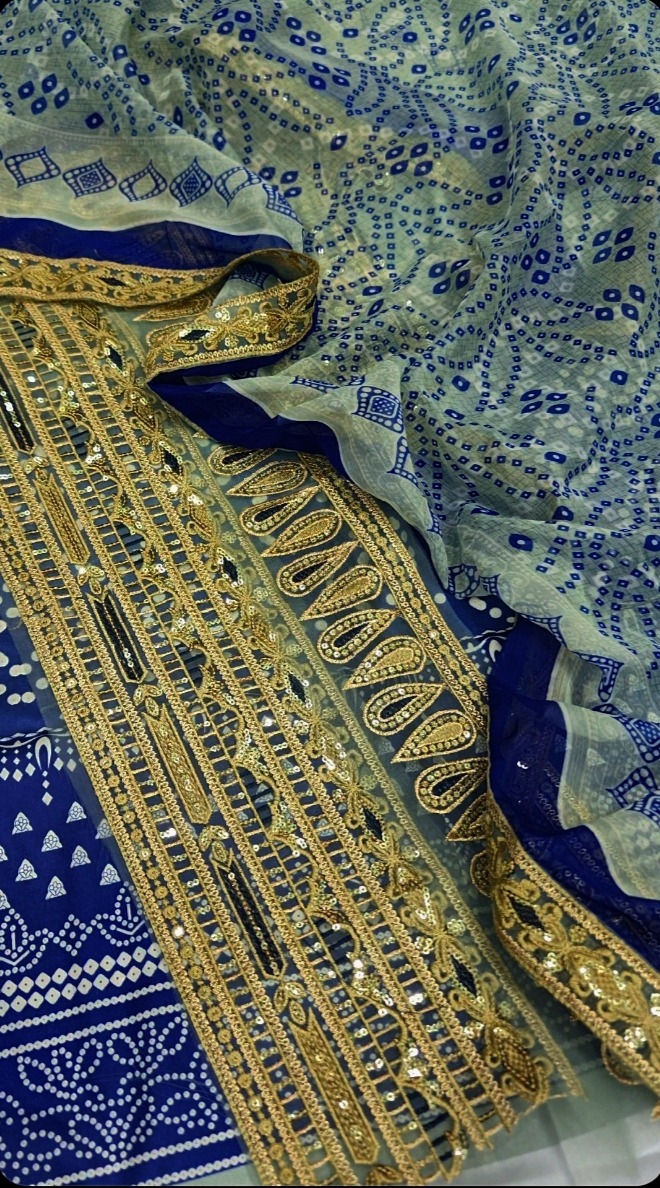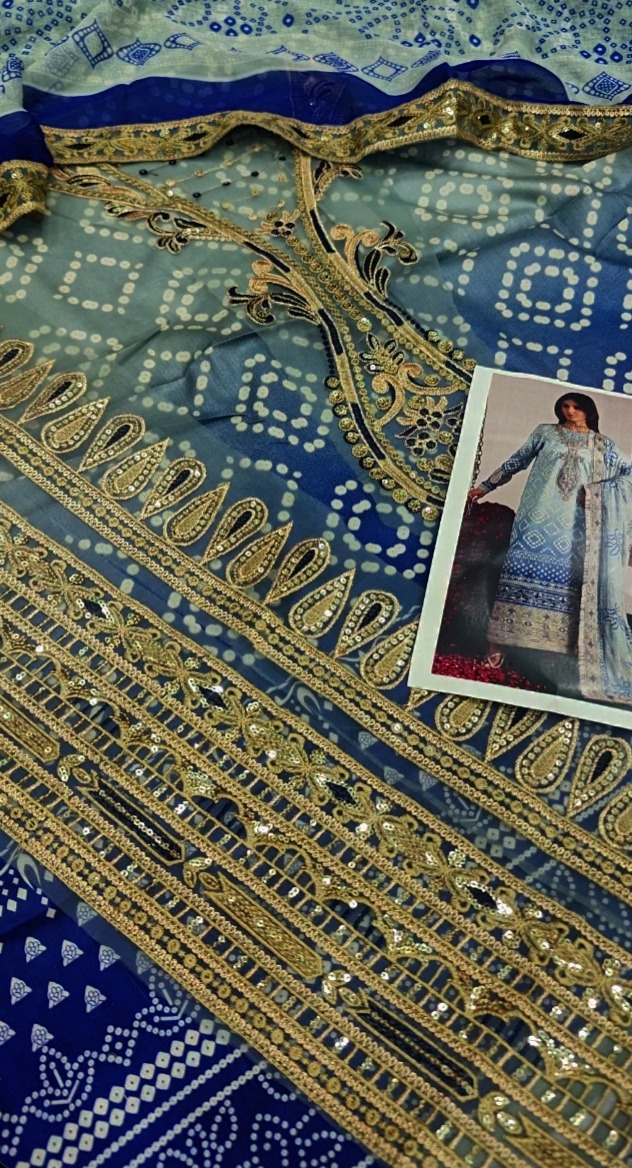 A sophisticated blue and white contrast dress with a gorgeously printed front and back and matching printed pants. Delicate prints and fashionable patch detailing adorn the sleeves, while a graceful daman patch and a neck patti embellished with fine thread embroidery finish the front. This ensemble offers the ideal balance of comfort and classic charm, finished with a lightweight chiffon dupatta.
