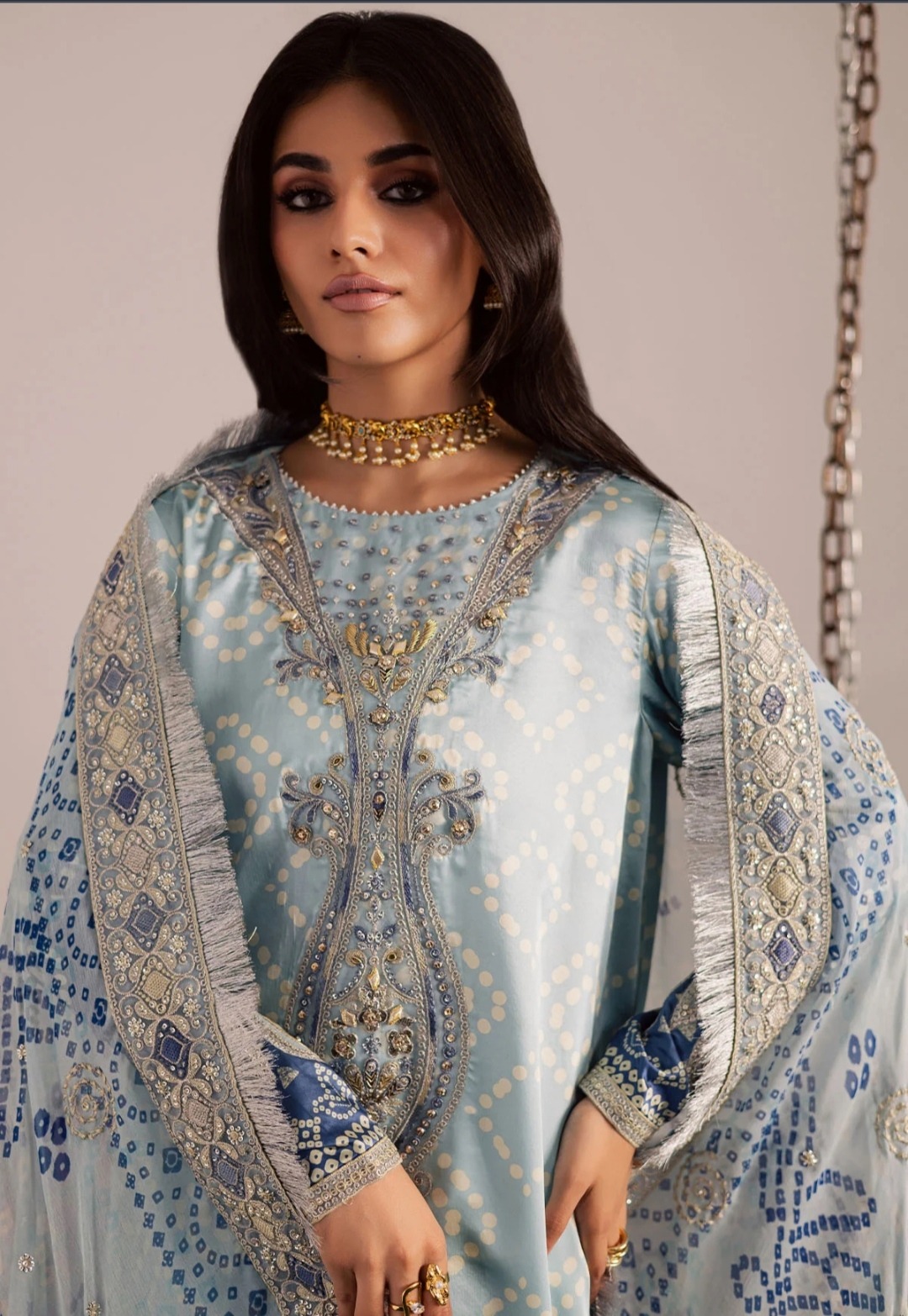 A sophisticated and high-end lawn ensemble designed for the summer. This export-quality design has an organza neck, daman patches, and a fully heavy embroidered front accentuated with laser work, giving it a rich and opulent appearance. The plain back and trousers maintain the ensemble's ideal balance and comfort, while the embroidered sleeves with patch details give added charm. It is combined with a ready-to-wear khaddi net dupatta finished with an elegant organza pallu, making it great for festival wear and formal events.