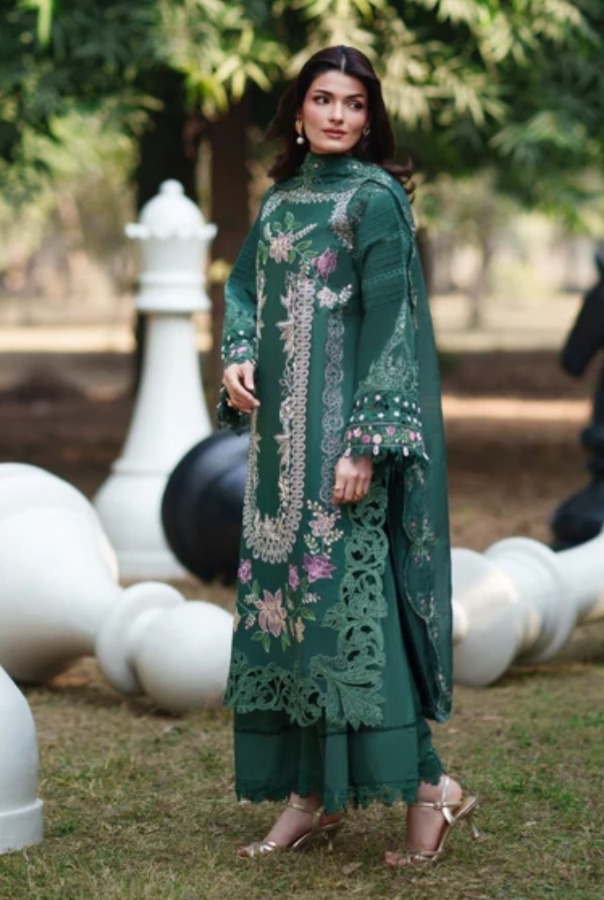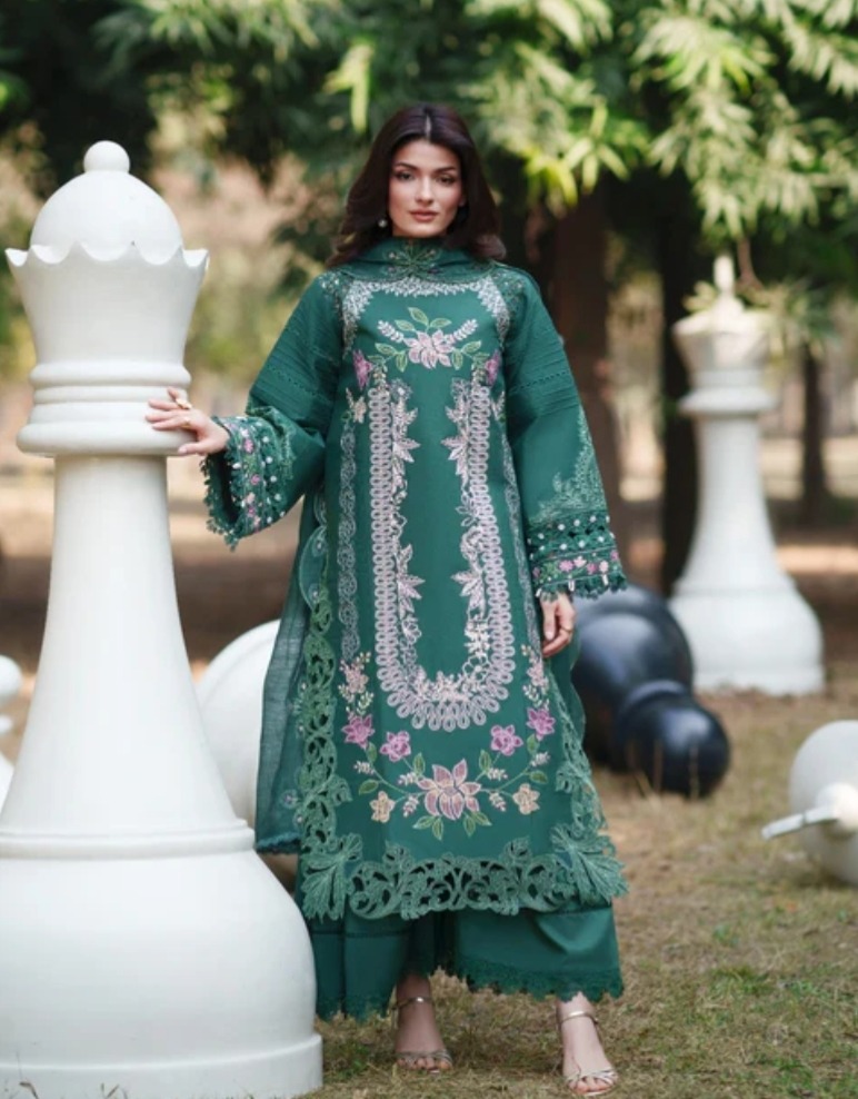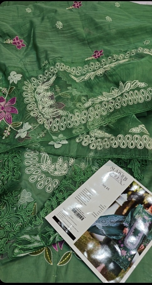 The **Summer Collection 2026**’s Parishay Lawn is a high-end summer ensemble composed of breathable, export-grade lawn fabric. For a well-balanced appearance, the back and pants are plain, while the front is fully embroidered with exquisite organza patches and embroidered patch sleeves. The dress is finished with an organza pallu and a ready-to-wear voil dupatta. At a wholesale price of **Rs. 4850**, which does not include delivery fees, it is available in stock.